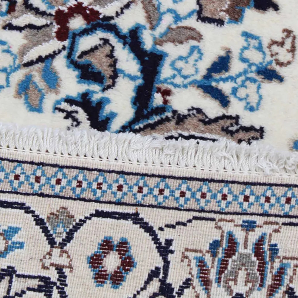 Posebna estetska vrednost perzijskih preprog Nain je predvsem posledica skrbno oblikovanih vzorcev in motivov, ki sledijo najboljšim tradicijam iranskega tkanja preprog. Najpogostejši vzorci vključujejo geometrijske oblike in cvetlične motive, ki jih navdihuje narava, ikonične elemente perzijske umetnosti. Ti motivi so ustvarjeni z zapletenimi in natančnimi tehnikami vozlanja, ki povečujejo občutljivost in podrobnosti preprog. Eden najbolj značilnih vzorcev je osrednji medaljon, ki je na sredini preprog in ga obdaja simetrična razporeditev cvetja, ind in arabesk. Oblika medaljona in harmonija vzorca okoli njega simbolizirata popolnost in ravnovesje, ki sta glavni temi islamske umetnosti. Tudi barvna paleta perzijskih preprog Nain je izjemna, saj se pogosto uporabljajo nežni pasteli, kot so smetana, slonova kost, svetlo modra in siva barva. Te barve poudarjajo eleganco in brezčasni slog preprog ter se odlično ujemajo z nežnimi, podrobnimi vzorci. Iranske preproge zato niso le funkcionalni predmeti, temveč imajo tudi umetniško vrednost, ki je lahko dragulj vsakega prostora.