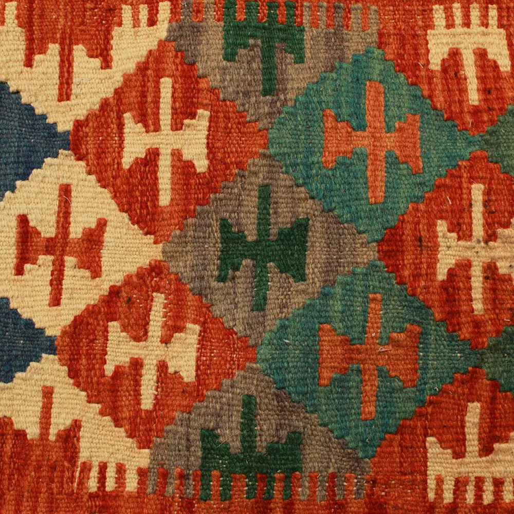 Oglejte si to ročno tkano okrasno blazino Kilim, ki je popolna mešanica tradicionalnega afganistanskega tkanja preprog in elegantnega domačega dekorja. Ta edinstvena prevleka za blazino Kilim bo s svojim elegantnim videzom, bogatimi barvami in osupljivimi vzorci oživila vsako notranjost. Ročno tkana prevleka za blazino je izdelana iz originalne afganistanske preproge Kilim, ki se odlično ujema z različnimi slogi pohištva in notranje opreme. Živahne barve in edinstveni vzorci ustvarijo vznemirljiv vizualni učinek in izboljšajo ambient v vašem prostoru, ne glede na to, ali gre za dnevno sobo ali spalnico. Iz afganistanske volne izdelana prevleka za blazino Kilim je enostavna za čiščenje, zato je vzdrževanje preprosto. Poleg tega trpežnost materiala zagotavlja, da boste v lepoti okrasne blazine Kilim na svojem pohištvu lahko uživali še vrsto let. Barve in vzorci blazine Kilim bodo zaradi temeljitega pranja po postopku tkanja dolgo časa ostali živahni. Ta skrbna obdelava zagotavlja dolgo življenjsko dobo in izvirno lepoto prevleke za blazino. Pisane okrasne blazine Kilim ponujajo široko paleto možnosti za zamisli o notranjem oblikovanju. Ne glede na to, ali želite v sobi ustvariti edinstveno vzdušje ali izboljšati obstoječe pohištvo, je barvita blazina Kilim odlična izbira.