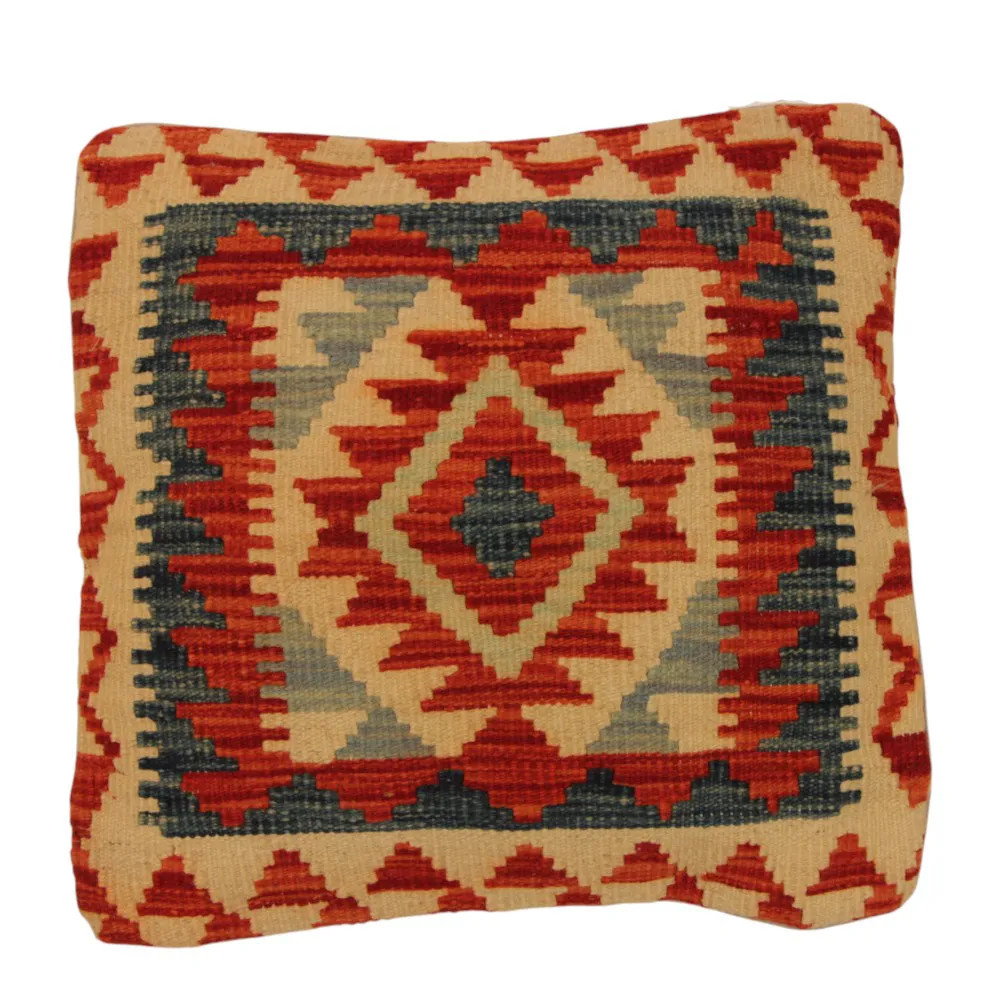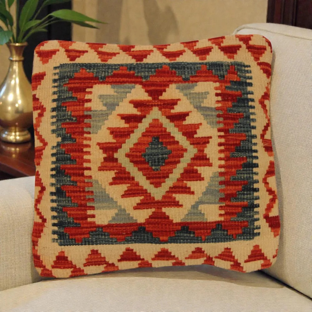 Oglejte si to ročno tkano okrasno blazino Kilim, ki je popolna mešanica tradicionalnega afganistanskega tkanja preprog in elegantnega domačega dekorja. Ta edinstvena prevleka za blazino Kilim bo s svojim elegantnim videzom, bogatimi barvami in osupljivimi vzorci oživila vsako notranjost. Ročno tkana prevleka za blazino je izdelana iz originalne afganistanske preproge Kilim, ki se odlično ujema z različnimi slogi pohištva in notranje opreme. Živahne barve in edinstveni vzorci ustvarijo vznemirljiv vizualni učinek in izboljšajo ambient v vašem prostoru, ne glede na to, ali gre za dnevno sobo ali spalnico. Iz afganistanske volne izdelana prevleka za blazino Kilim je enostavna za čiščenje, zato je vzdrževanje preprosto. Poleg tega trpežnost materiala zagotavlja, da boste v lepoti okrasne blazine Kilim na svojem pohištvu lahko uživali še vrsto let. Barve in vzorci blazine Kilim bodo zaradi temeljitega pranja po postopku tkanja dolgo časa ostali živahni. Ta skrbna obdelava zagotavlja dolgo življenjsko dobo in izvirno lepoto prevleke za blazino. Pisane okrasne blazine Kilim ponujajo široko paleto možnosti za zamisli o notranjem oblikovanju. Ne glede na to, ali želite v sobi ustvariti edinstveno vzdušje ali izboljšati obstoječe pohištvo, je barvita blazina Kilim odlična izbira.