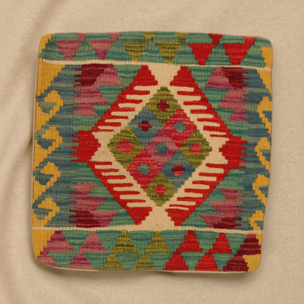 Oglejte si to ročno tkano okrasno blazino Kilim, ki je popolna mešanica tradicionalnega afganistanskega tkanja preprog in elegantnega domačega dekorja. Ta edinstvena prevleka za blazino Kilim bo s svojim elegantnim videzom, bogatimi barvami in osupljivimi vzorci oživila vsako notranjost. Ročno tkana prevleka za blazino je izdelana iz originalne afganistanske preproge Kilim, ki se odlično ujema z različnimi slogi pohištva in notranje opreme. Živahne barve in edinstveni vzorci ustvarijo vznemirljiv vizualni učinek in izboljšajo ambient v vašem prostoru, ne glede na to, ali gre za dnevno sobo ali spalnico. Iz afganistanske volne izdelana prevleka za blazino Kilim je enostavna za čiščenje, zato je vzdrževanje preprosto. Poleg tega trpežnost materiala zagotavlja, da boste v lepoti okrasne blazine Kilim na svojem pohištvu lahko uživali še vrsto let. Barve in vzorci blazine Kilim bodo zaradi temeljitega pranja po postopku tkanja dolgo časa ostali živahni. Ta skrbna obdelava zagotavlja dolgo življenjsko dobo in izvirno lepoto prevleke za blazino. Pisane okrasne blazine Kilim ponujajo široko paleto možnosti za zamisli o notranjem oblikovanju. Ne glede na to, ali želite v sobi ustvariti edinstveno vzdušje ali izboljšati obstoječe pohištvo, je barvita blazina Kilim odlična izbira.