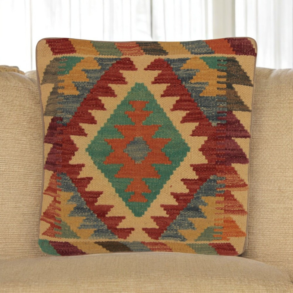 Oglejte si to ročno tkano okrasno blazino Kilim, ki je popolna mešanica tradicionalnega afganistanskega tkanja preprog in elegantnega domačega dekorja. Ta edinstvena prevleka za blazino Kilim bo s svojim elegantnim videzom, bogatimi barvami in osupljivimi vzorci oživila vsako notranjost. Ročno tkana prevleka za blazino je izdelana iz originalne afganistanske preproge Kilim, ki se odlično ujema z različnimi slogi pohištva in notranje opreme. Živahne barve in edinstveni vzorci ustvarijo vznemirljiv vizualni učinek in izboljšajo ambient v vašem prostoru, ne glede na to, ali gre za dnevno sobo ali spalnico. Iz afganistanske volne izdelana prevleka za blazino Kilim je enostavna za čiščenje, zato je vzdrževanje preprosto. Poleg tega trpežnost materiala zagotavlja, da boste v lepoti okrasne blazine Kilim na svojem pohištvu lahko uživali še vrsto let. Barve in vzorci blazine Kilim bodo zaradi temeljitega pranja po postopku tkanja dolgo časa ostali živahni. Ta skrbna obdelava zagotavlja dolgo življenjsko dobo in izvirno lepoto prevleke za blazino. Pisane okrasne blazine Kilim ponujajo široko paleto možnosti za zamisli o notranjem oblikovanju. Ne glede na to, ali želite v sobi ustvariti edinstveno vzdušje ali izboljšati obstoječe pohištvo, je barvita blazina Kilim odlična izbira.
